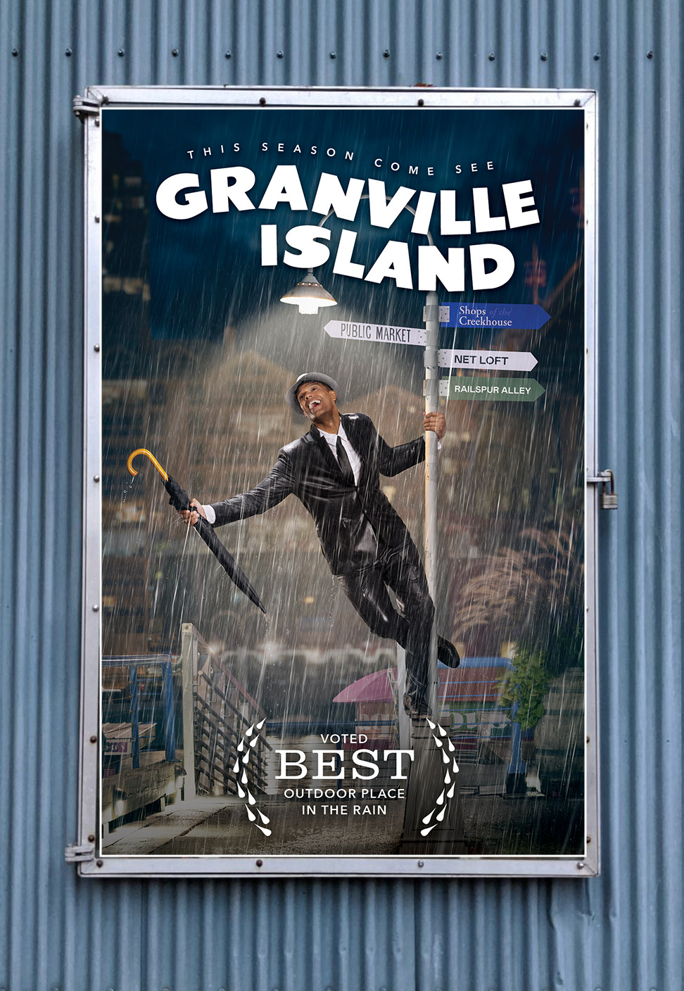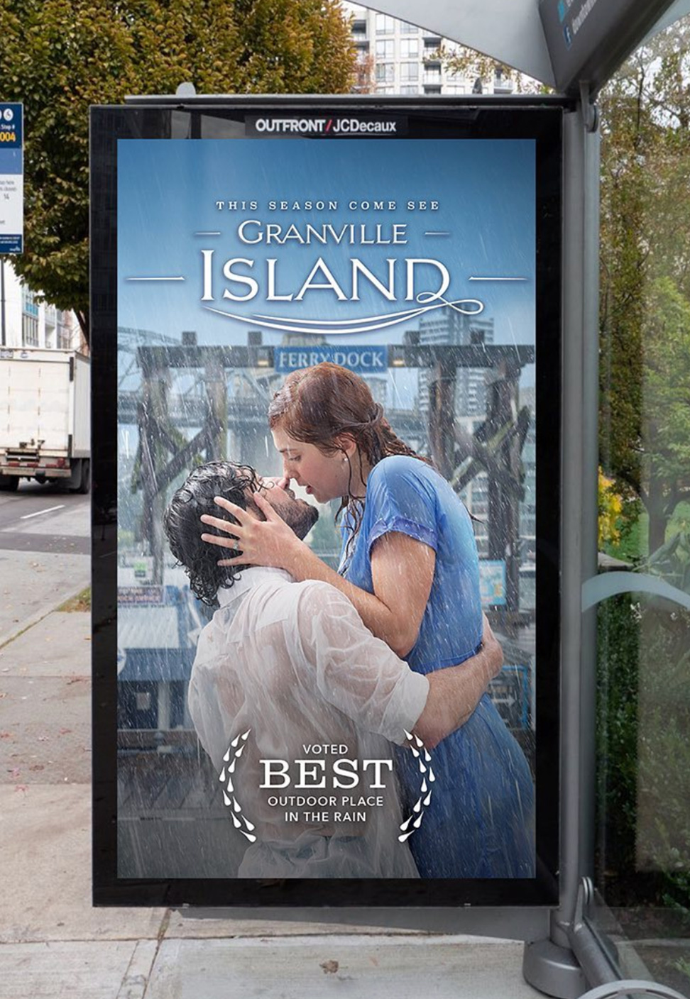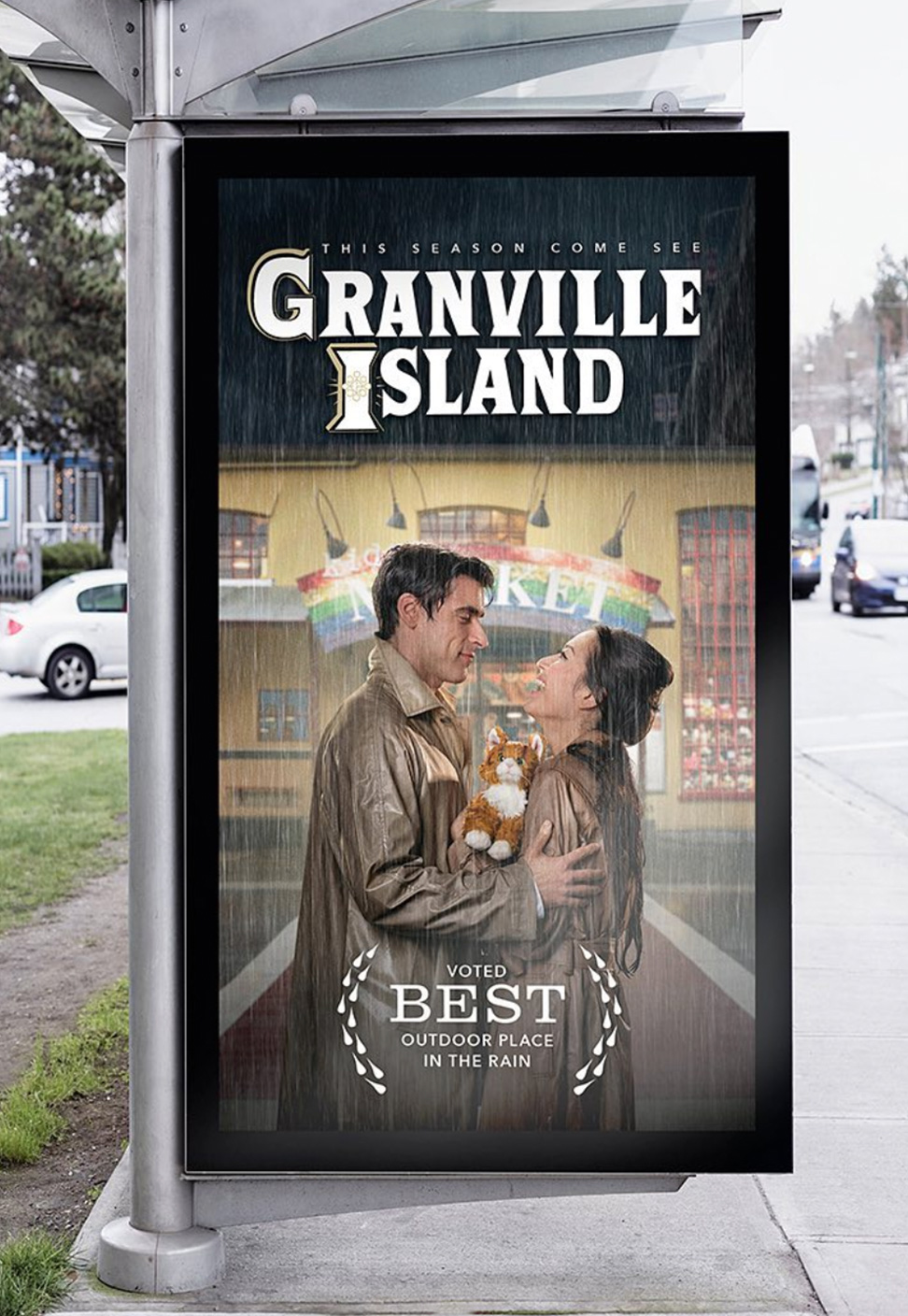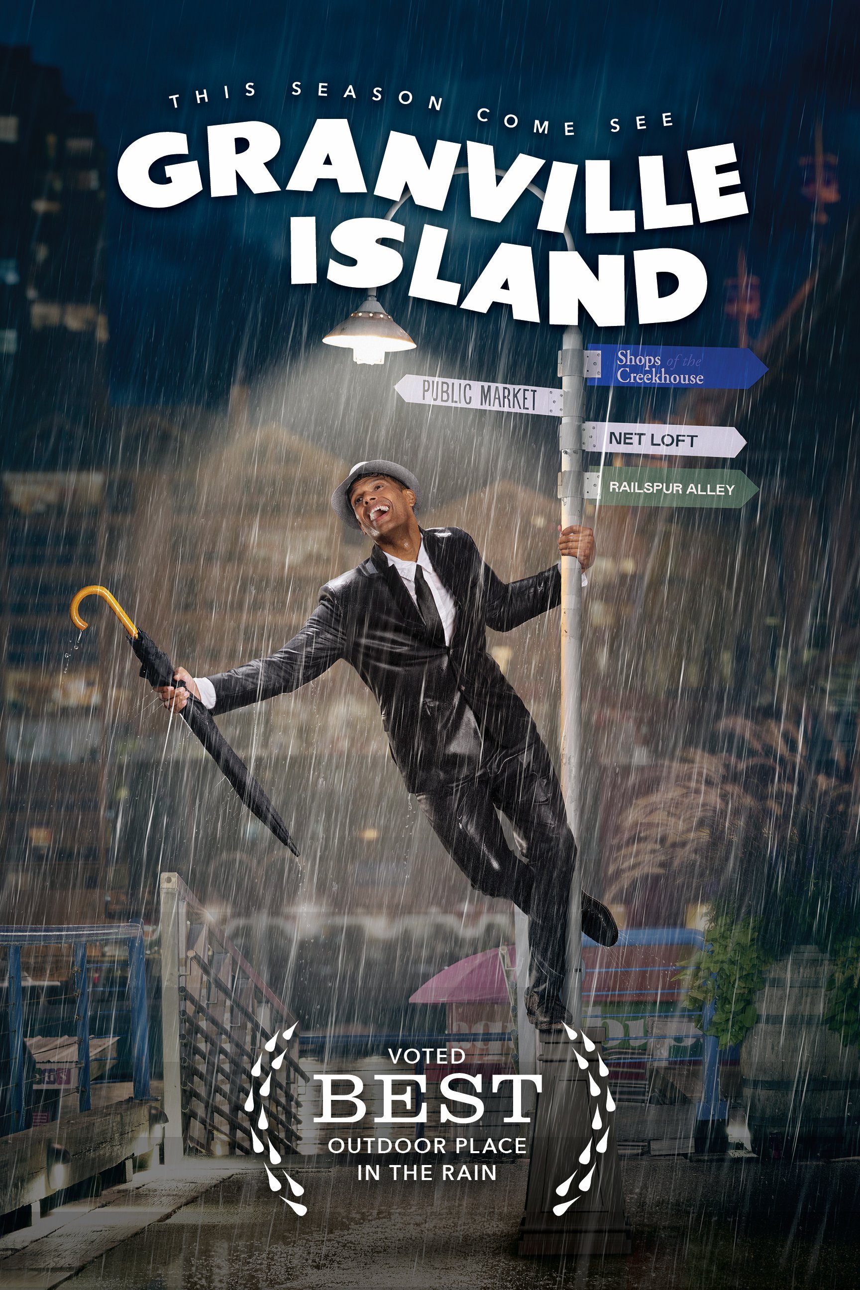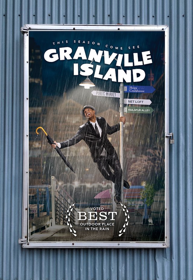 We re-created rainy scenes from iconic movies with a Granville Island backdrop to draw attention to the cinematic and charming qualities that the island has to offer, even in the rain.